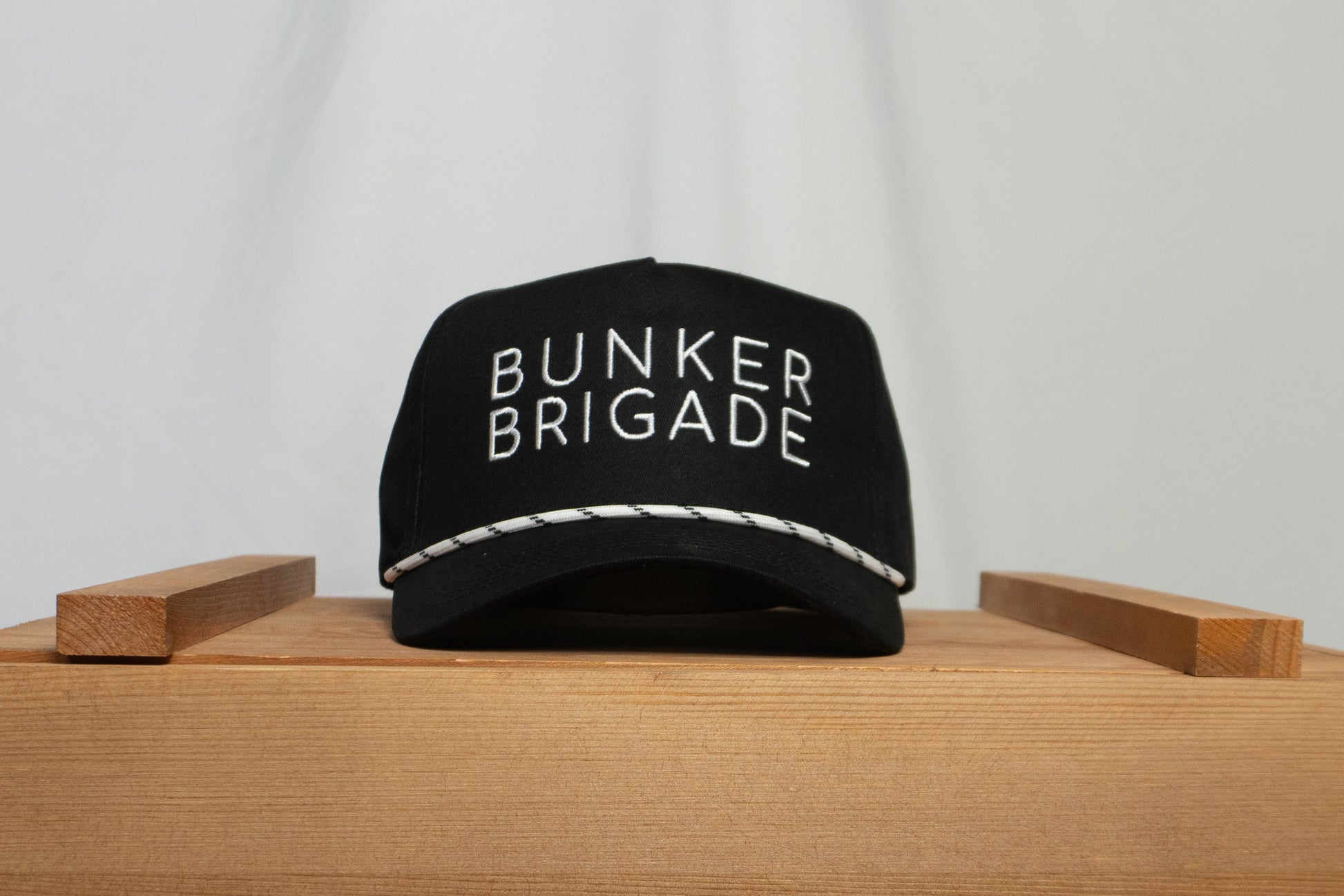 White rope detail with black stitching above the brim