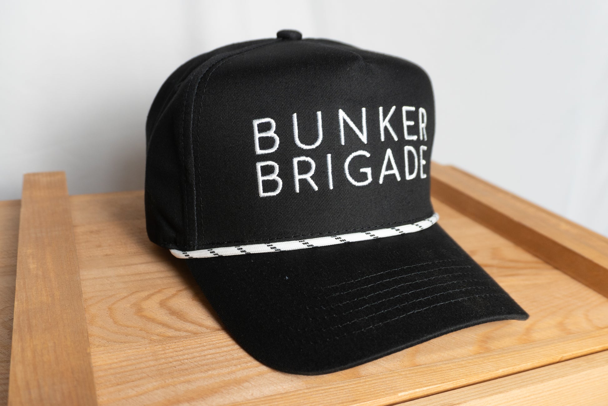 Make a bold statement on and off the course with the Bunker Brigade Baseball Cap. This premium black snapback combines timeless style with modern flair, featuring crisp white embroidery of the BUNKER BRIGADE logo across the front panel. A standout detail is the custom white rope accent with black stitch pattern across the brim, adding a unique touch that sets this hat apart.